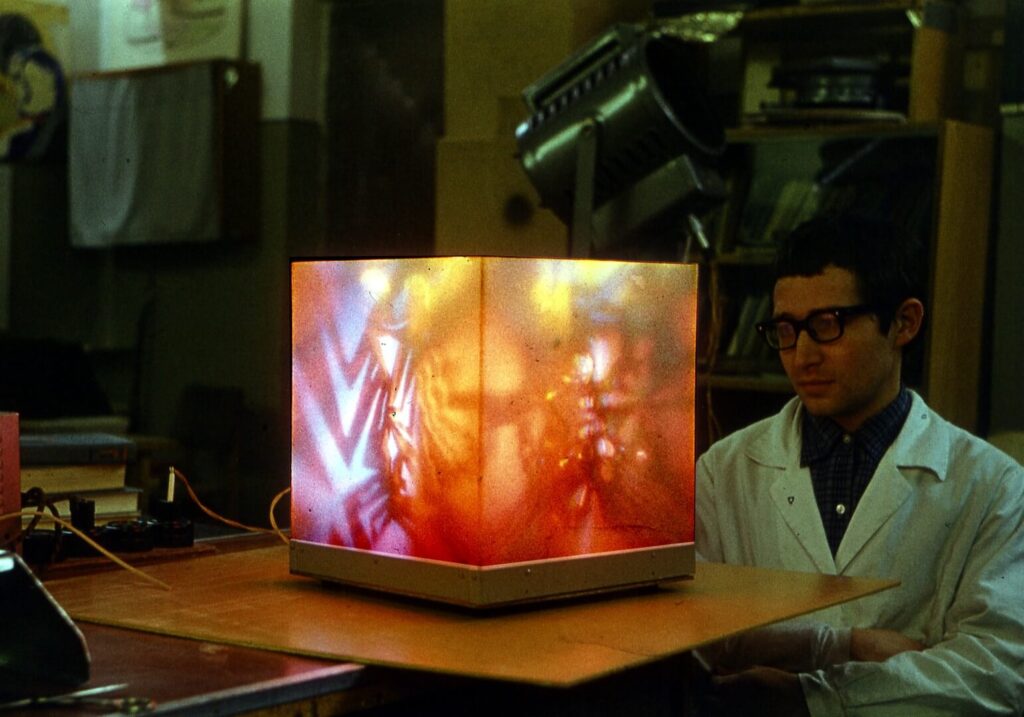Экран трехканальной автоматической светомузыкальной установки (АСМУ) серии «Ялкын» (по татарски — «Пламя») имеет форму куба, внутри которого вращаются два кубических же трафарета (из прозрачного стекла или из листового дюралюминия, с линзами на некоторых отверстиях). Внутри малого куба — трафарета находятся три лампы типа БК100-220 В.